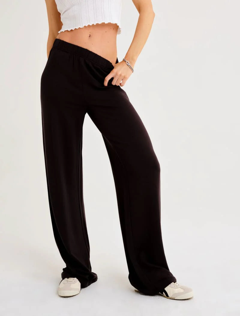 Experience the ultimate in comfort and style with the Kia Lounge Pant in Black. Featuring a high-rise elastic waistband, wide-leg silhouette, and soft stretch fabric, these pants are perfect for lounging at home or dressing up for casual outings. Pair with a fitted top or oversized sweater for a chic, versatile look that effortlessly combines relaxation with modern sophistication. Your new wardrobe staple awaits.