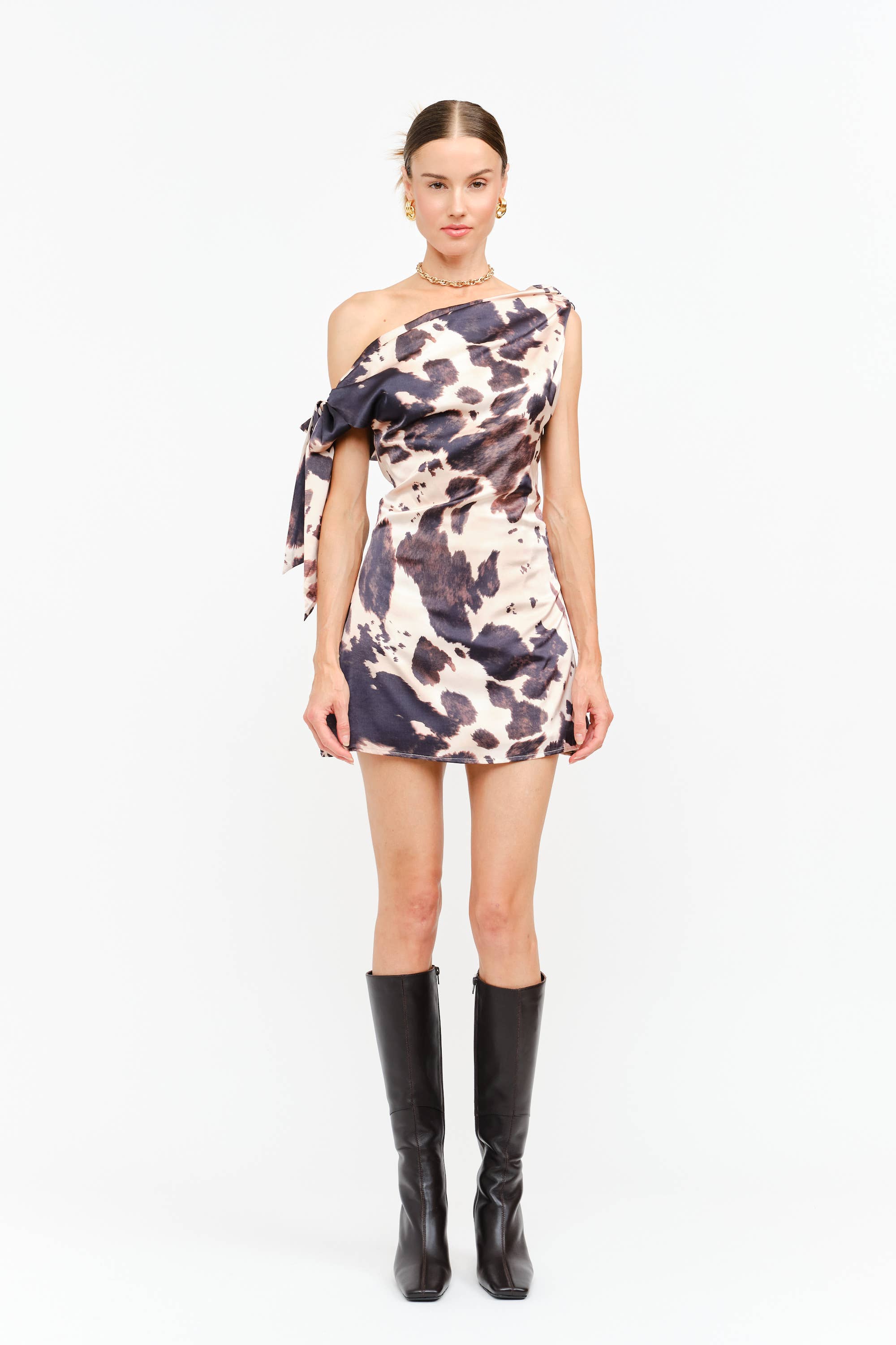 Natasha Dress : Turn heads in this statement-making mini dress that blends modern edge with romantic allure. Designed in a silky satin finish, its striking cow-print pattern and asymmetric silhouette make it the ultimate piece for nights that call for drama. - One-shoulder neckline with self-tie detail - Luxurious satin fabrication with a soft sheen - Sculpted mini length for a leg-lengthening look - Bold cow-print pattern, perfectly playful yet chic - Side zipper for a seamless fit Care Instructions: - Hand wash cold - Do not bleach - Line dry - Iron low if needed - Do not tumble dry Fabric Content: Self: 100% Polyester Lining: 92% Polyester, 8% Spandex Model is 5'11" and is wearing a size small