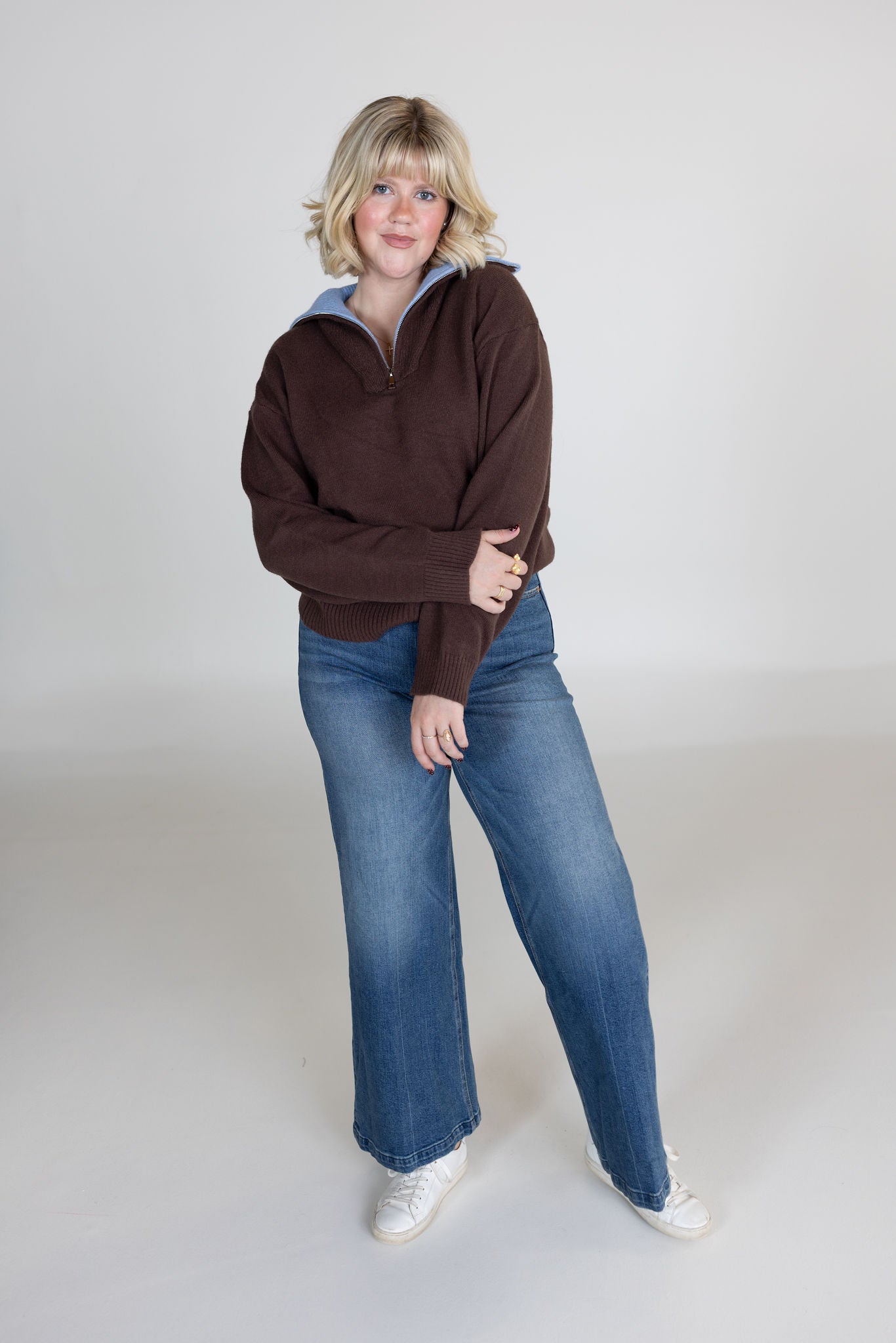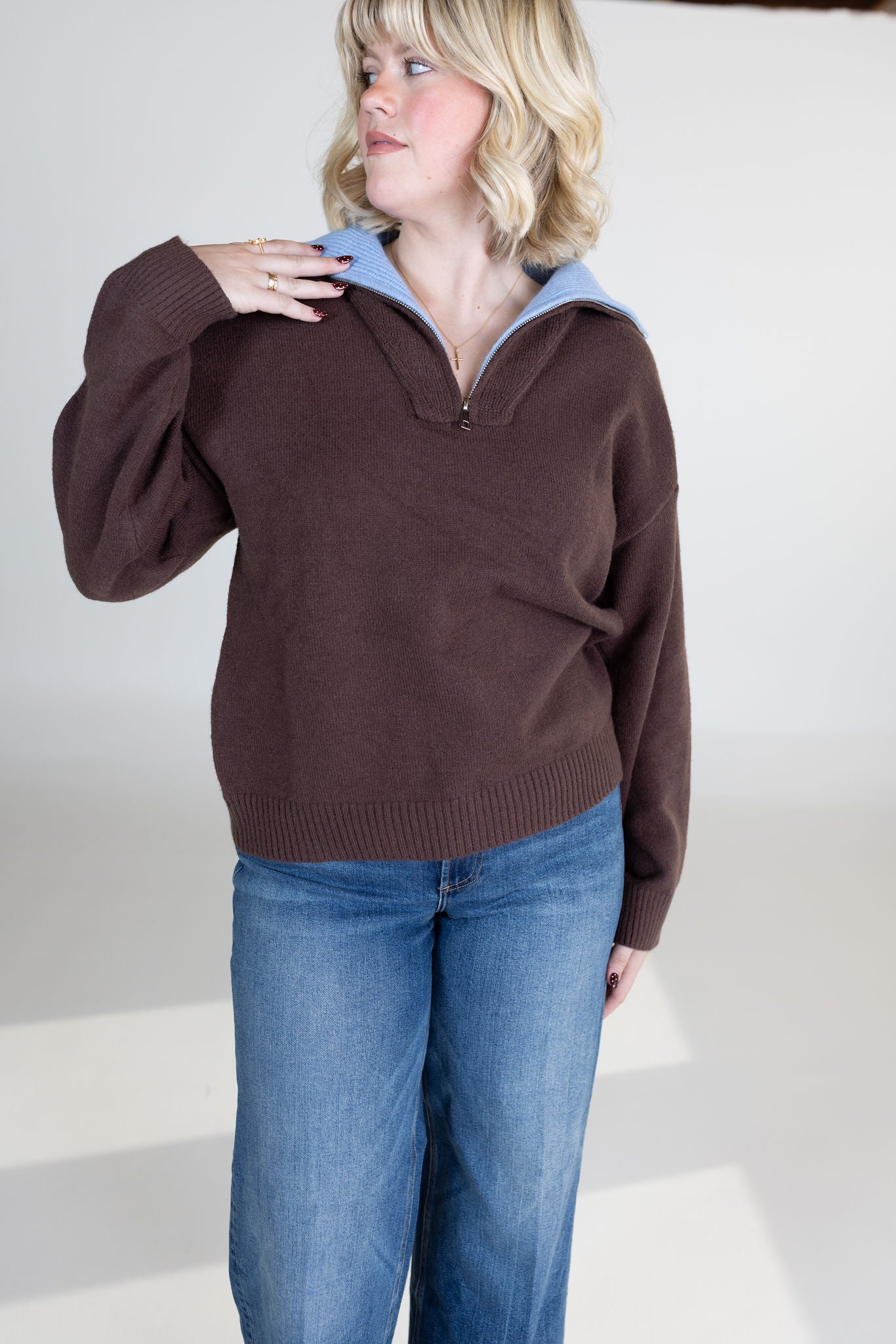 Stay cozy and stylish in the Cambridge Quarter-Zip Sweater, featuring a relaxed fit and soft sweater knit fabric. The oversized collar and drop shoulders add modern flair, while ribbed trim and duo-tone design elevate its casual-chic look. Perfect for layering over leggings, jeans, or skirts, this versatile sweater is ideal for weekend outings, cozy office days, or chilly evenings. Effortless comfort meets contemporary style in this must-have wardrobe essential.