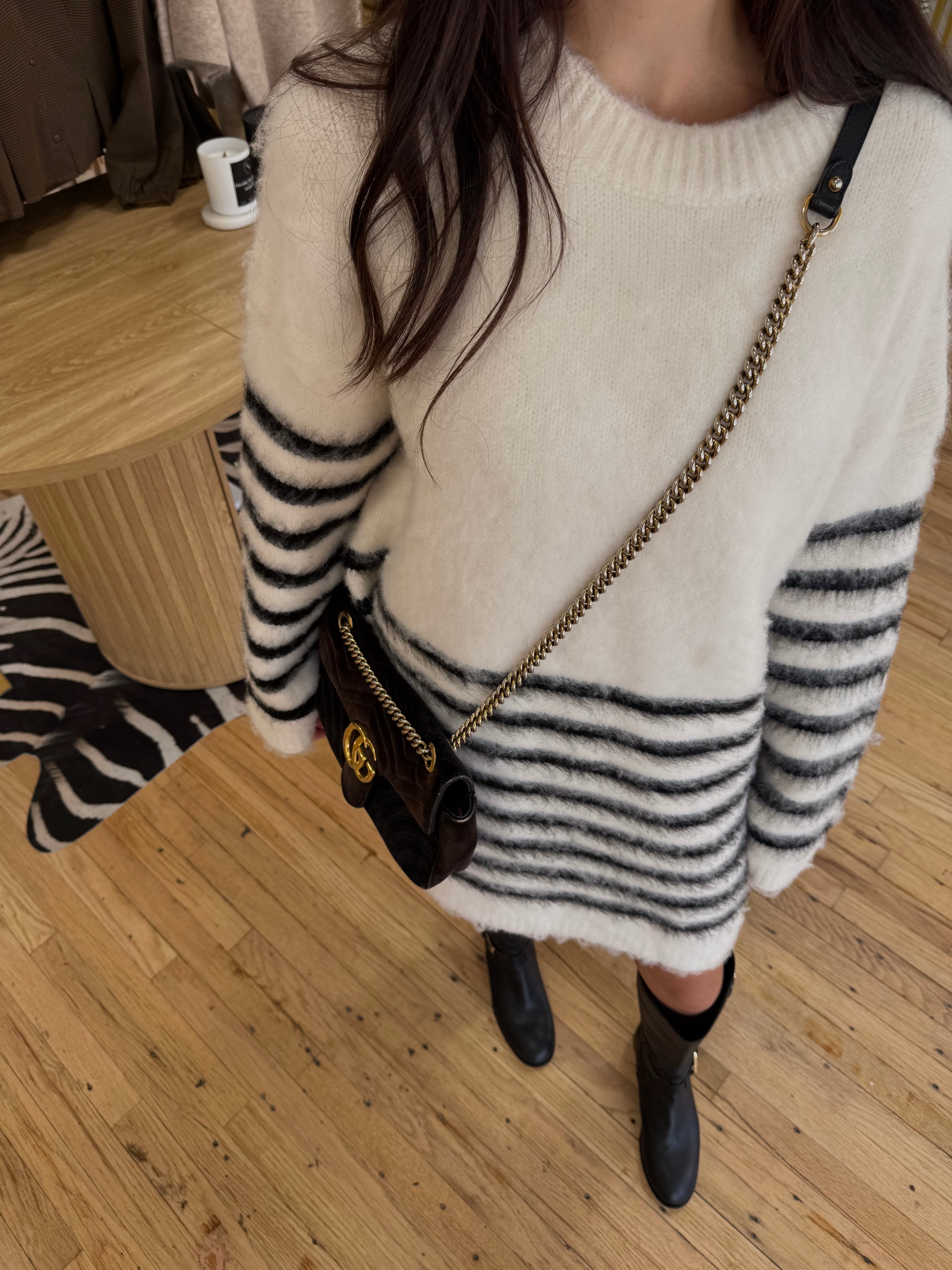 Stay cozy and stylish in the Harper Striped Sweater Mini Dress, crafted from soft sweater knit for ultimate comfort. Featuring a classic striped pattern, long sleeves, and a crew neckline with ribbed trim, this knee-length dress offers a relaxed, loose fit that moves with you. Perfect for layering with boots or sneakers, it’s ideal for casual outings, coffee dates, or weekend errands. Effortlessly chic, playful, and versatile for year-round wear.