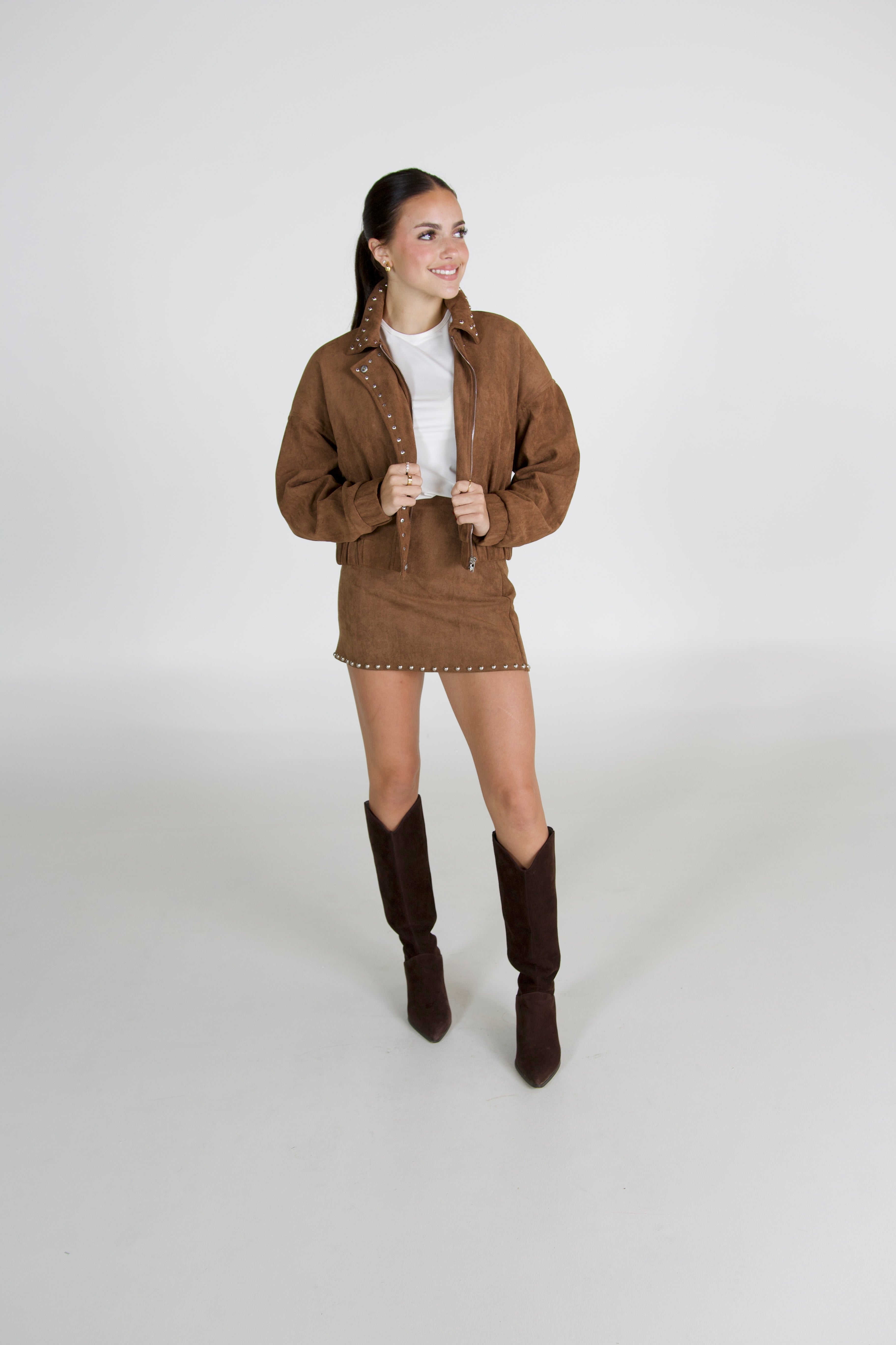 Meet your new statement layer—the Kendal Studded Suede Jacket. Designed in soft faux suede with a relaxed fit, this jacket features silver stud accents that add a western-chic edge to any outfit. The zip-front closure and collared neckline give it that timeless, structured look while keeping it effortlessly cool. Pair it with the matching mini skirt and boots for a complete set or throw it over denim and a tee for everyday wear with attitude.