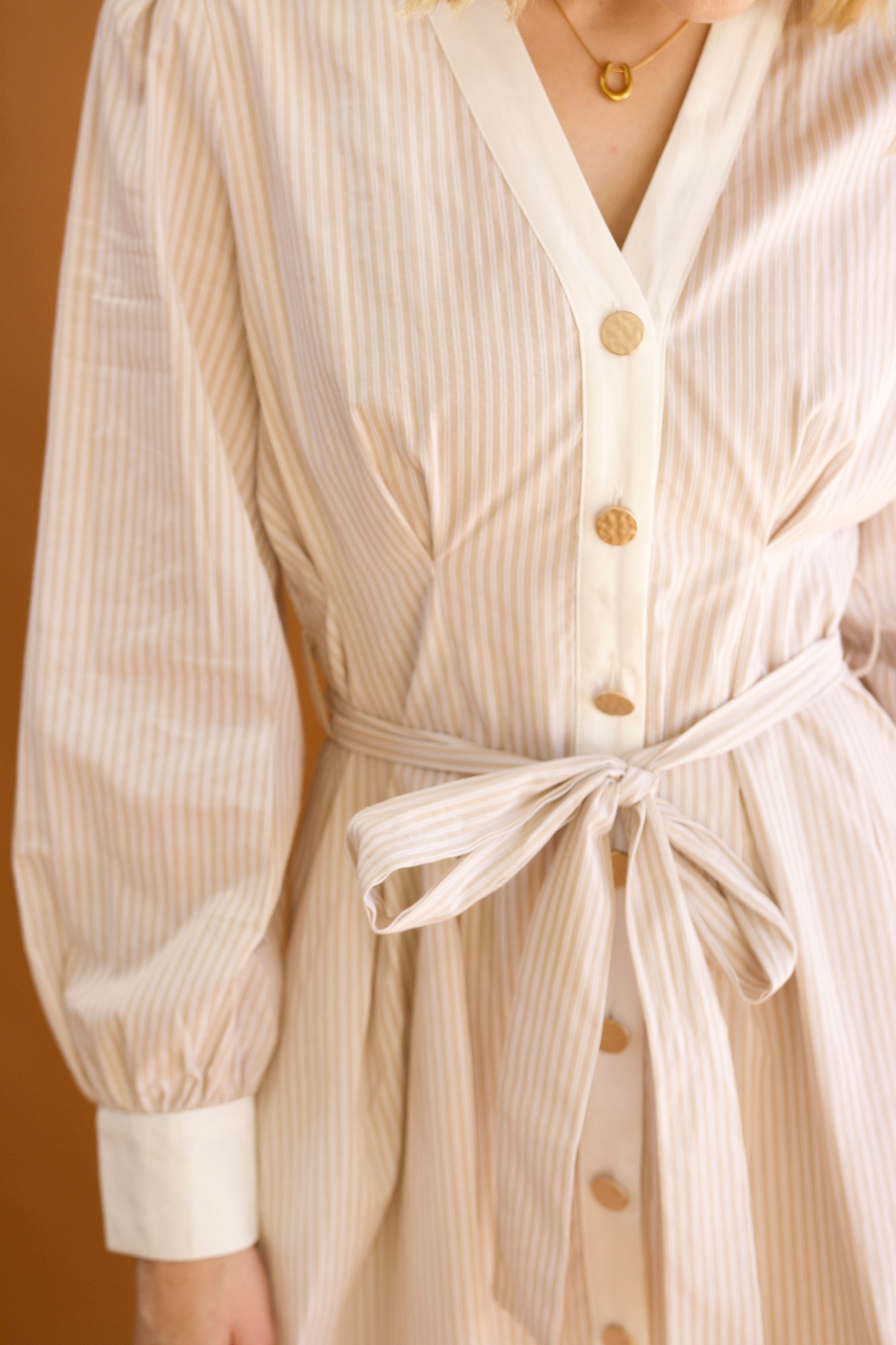 The Penny Button-Up Collared Mini Dress blends classic charm with modern flair. Featuring long puff sleeves with cuffed contrast trim, a collared neckline, and a flattering waist tie, it offers a relaxed, easy fit. The striped pattern and mini length create a playful yet polished look, while the button-front design adds timeless detail. Perfect for brunches, casual outings, or weekend adventures, this dress pairs effortlessly with sandals or ankle boots for chic, versatile style.