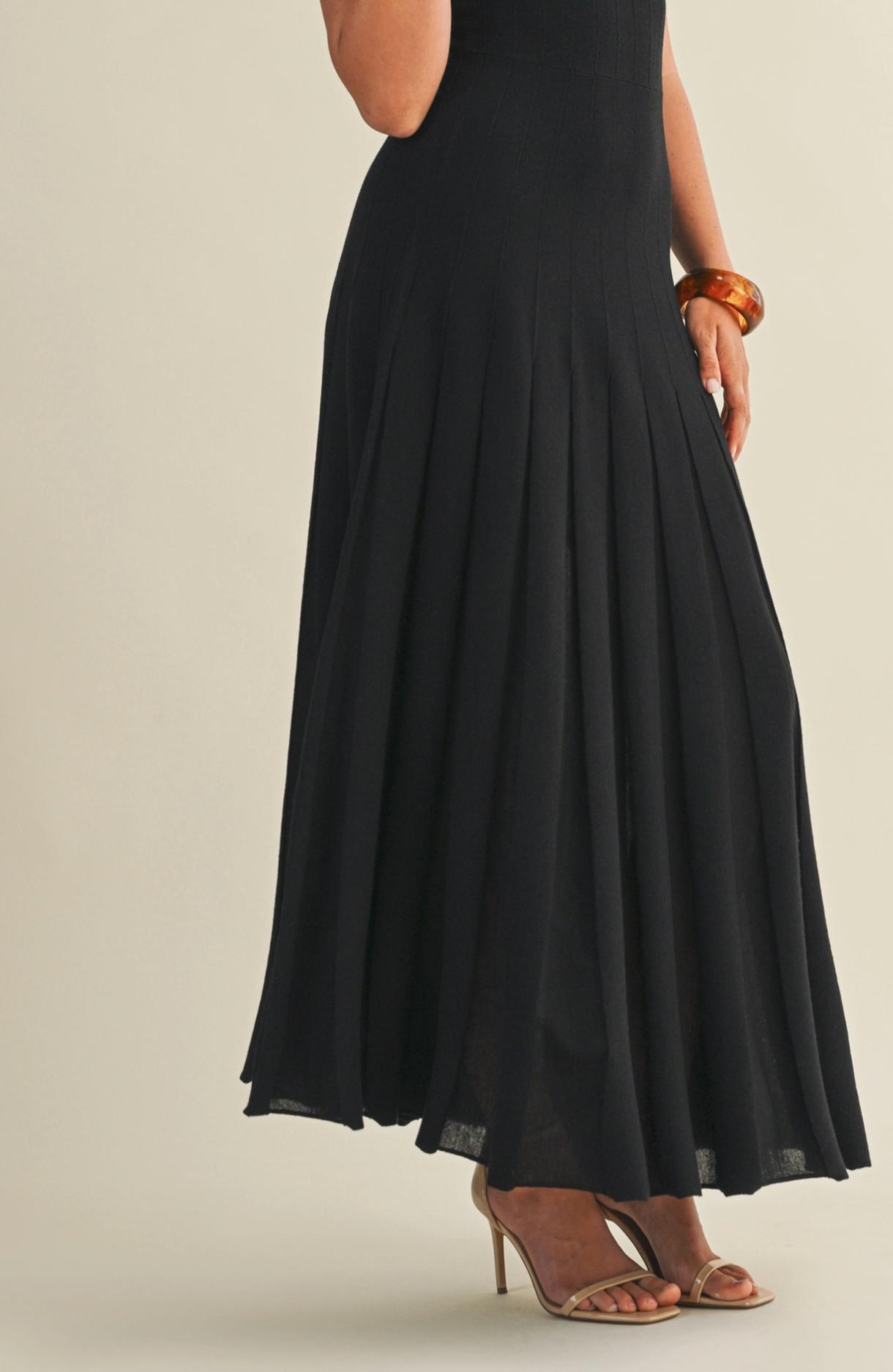 The Ellie Knit Maxi in black defines chic minimalism with its clean lines and timeless silhouette. Featuring a sleek boat neckline, sleeveless design, and softly pleated skirt, this dress flows with effortless elegance. The fitted bodice flatters your shape while the relaxed skirt adds graceful movement. Perfect for dinner dates, evening events, or polished everyday wear — pair it with gold jewelry and heels for a look that’s both sophisticated and understated.