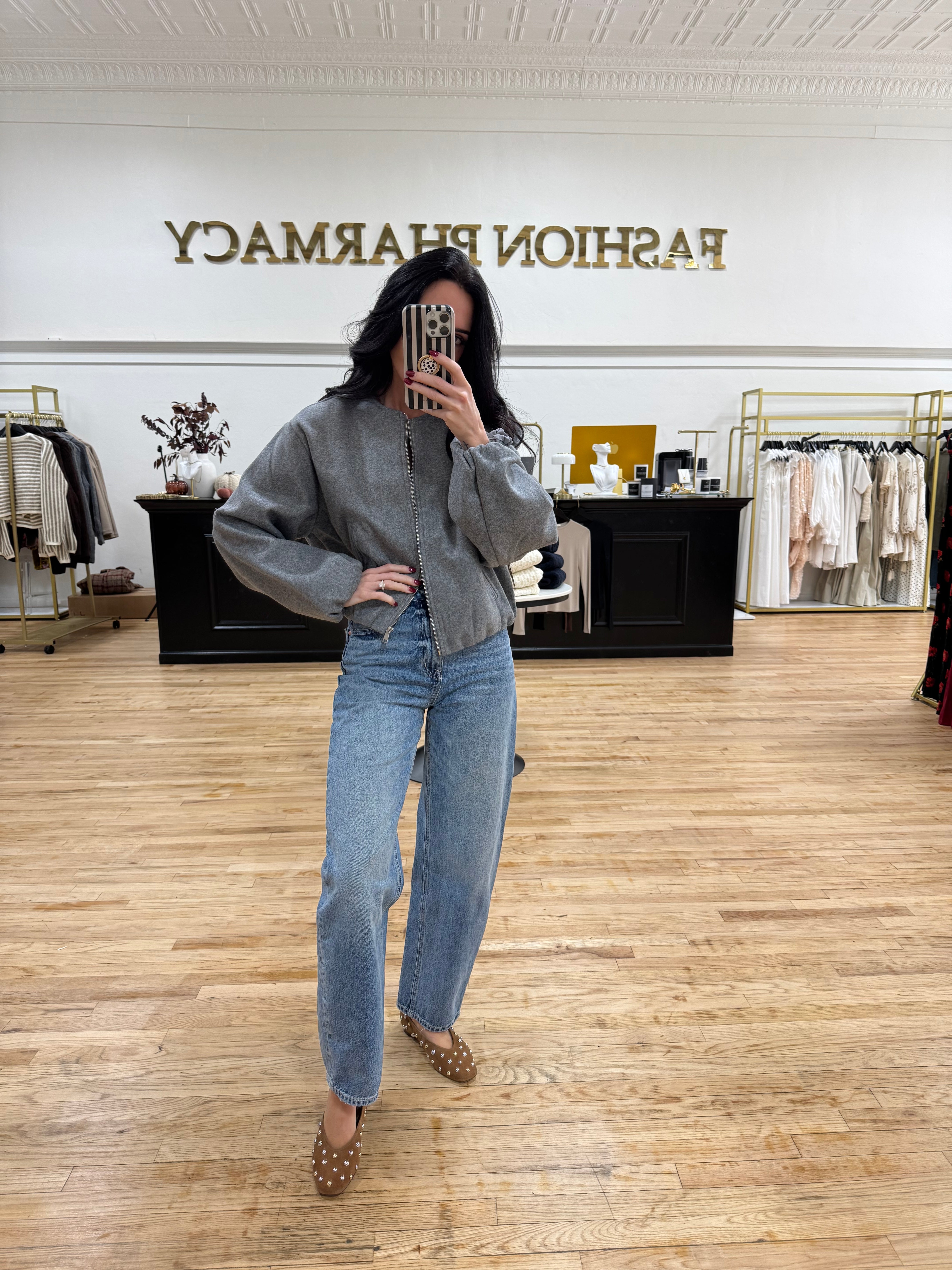 Effortless sophistication meets everyday comfort in the Park Avenue Grey Bomber Jacket. This modern take on a classic silhouette features a soft wool-blend exterior with a minimal, structured design. The zip front and elasticized hem create a clean shape, while subtle volume through the sleeves adds a touch of casual polish. Perfect for layering over knits, tees, or dresses — it’s the jacket you’ll reach for again and again.