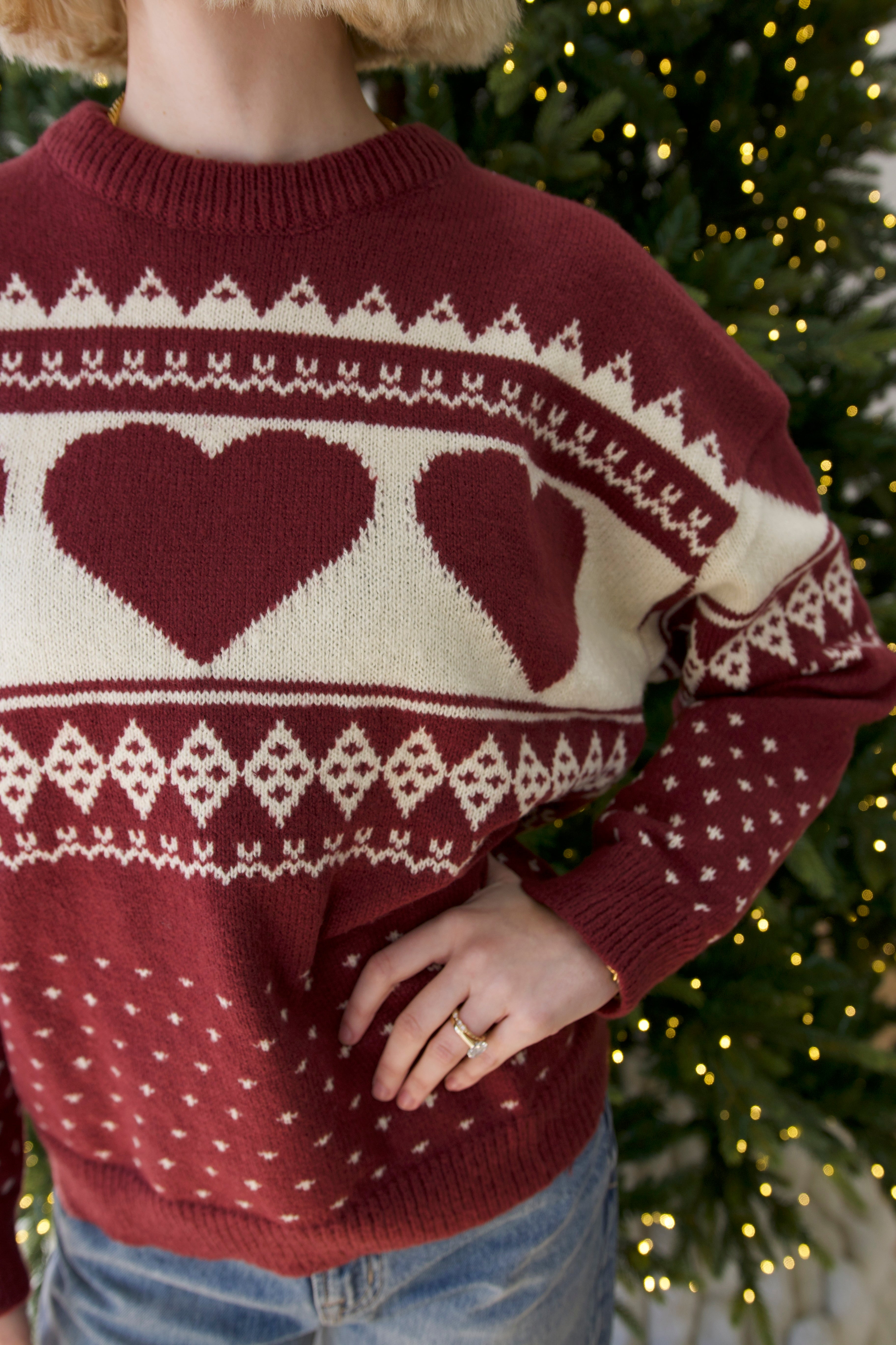 Fall in love with cozy charm in the Shayla Heart Fair Isle Sweater. Designed in a warm burgundy and cream palette, this soft knit features a sweet heart Fair Isle pattern, drop shoulders, and a relaxed fit for effortless comfort. Perfect for pairing with jeans or faux leather pants, it’s a must-have for adding a touch of romance to chilly days. Finished with ribbed trim and a classic round neckline, this sweater blends timeless style with modern coziness.