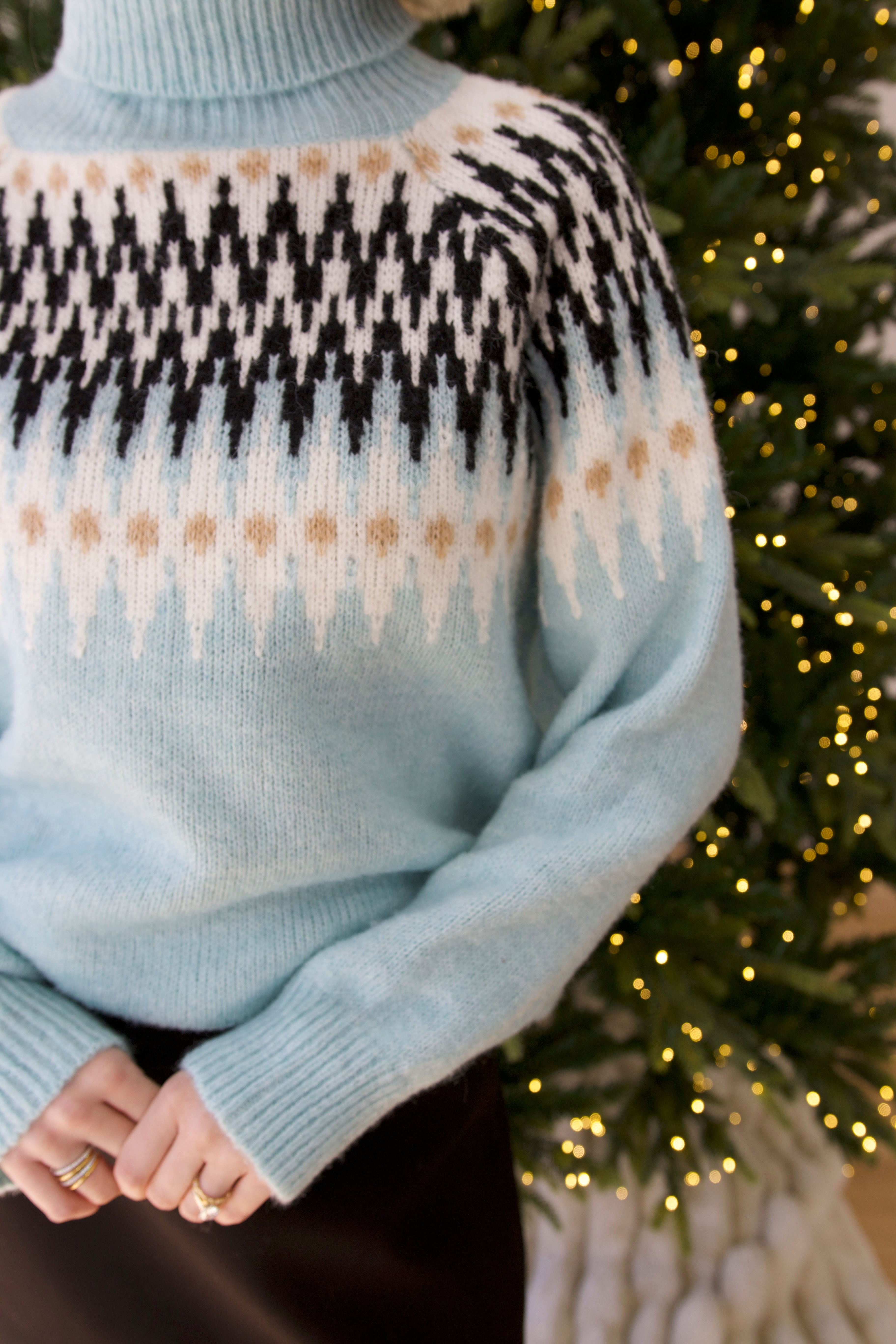 The Taylor Fair Isle Knit Turtleneck Sweater captures cozy winter charm with its classic pattern and relaxed silhouette. Crafted from soft sweater knit fabric, it features a warm turtleneck, long sleeves, and ribbed trim for a comfortable, polished fit. Perfect for layering on chilly days, this Fair Isle sweater pairs effortlessly with jeans, leggings, or skirts for a timeless cold-weather look that’s equal parts stylish, snug, and effortlessly chic.