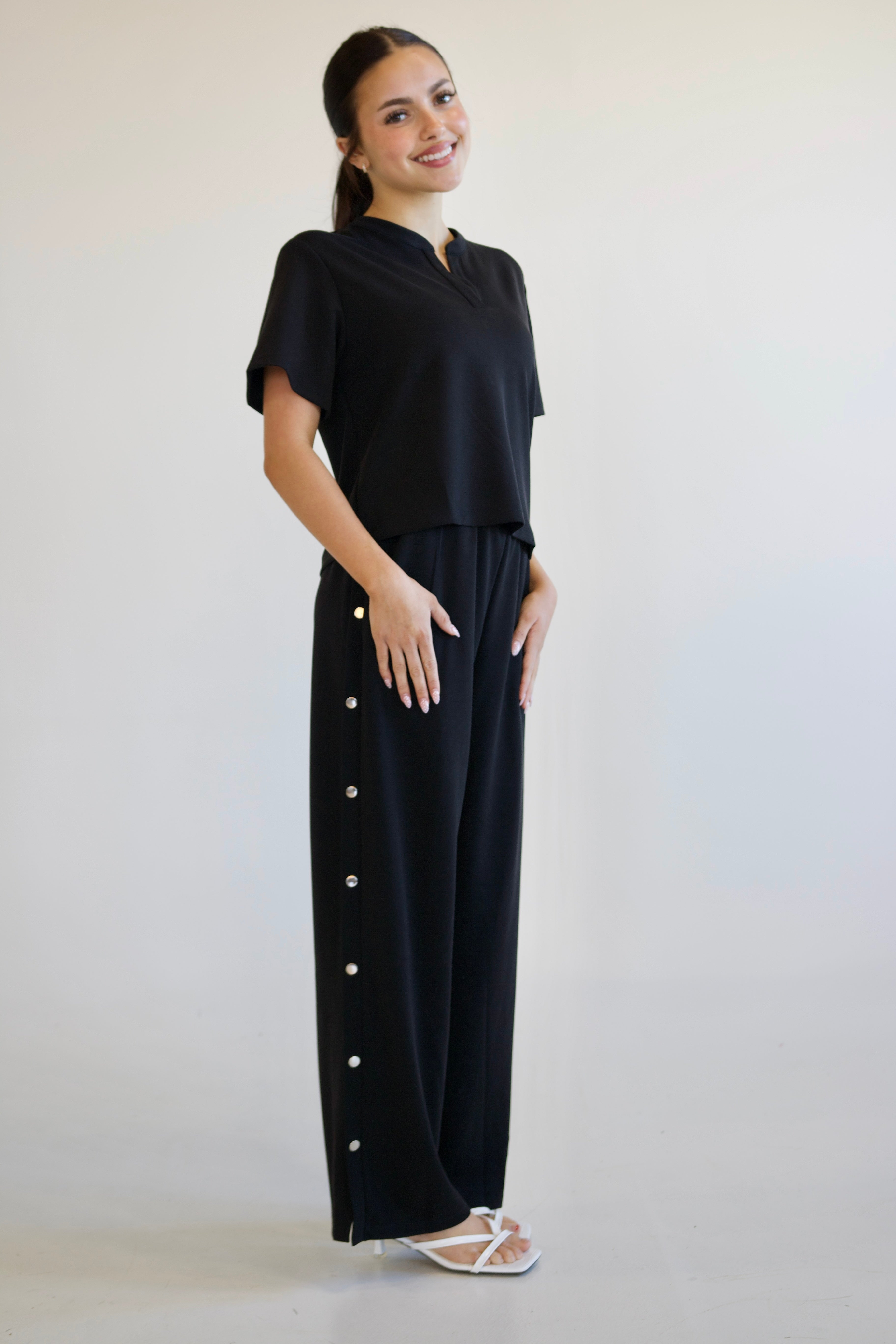 The Urban Luxe Pant are a sleek elevated essential featuring a statement silver button detail on the side. Designed to dress up or down, these versatile pants pair effortlessly with blouses, tees or sweaters, making them a wardrobe staple that combines refined style, comfort, and everyday sophistication.